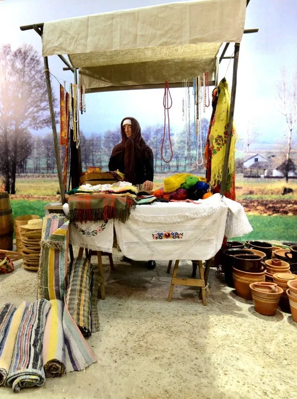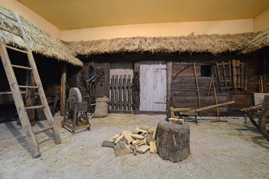 Stała wystawa etnograficzna pt. Szare jak ziemia, barwne jak pamięć poświęcona jest człowiekowi - twórcy, a zarazem "wytworowi" kultury wsi okresu dwudziestolecia międzywojennego, na terenie Polski środkowej (na wystawie reprezentowane są regiony: opoczyński, rawski, łowicki i sieradzki). W owym czasie wieś pozostawała jeszcze w pewnej izolacji od świata zewnętrznego, co sprzyjało utrzymywaniu się postaw zachowawczych, a wraz z nimi systemu społeczno-kulturowego, który opierał się na wartościach związanych z ziemią, lokalnością, kultywowaniem miejscowej tradycji, działaniem kontroli społecznej i na autorytecie starszych. Dlatego też mimo indywidualizacji losów jednostek, istniał na wsi pewien schemat kulturowy ludzkiej drogi życiowej. Koleje życia człowieka stanowią główny wątek narracyjny prezentowanej wystawy, a poszczególne jej części są "wizerunkami" następujących po sobie etapów biografii chłopskiej.